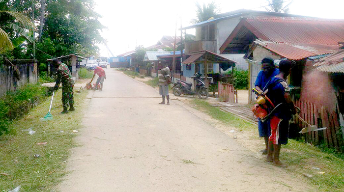 Sorong – Babinsa Koramil 1704-13/Sorong Barat Sertu S. Mambrasar bersama masyarakat melaksanakan kegiatan karya bakti membersihkan jalan poros di Kelurahan Suprau Kota Sorong, Selasa (17/10/2017).