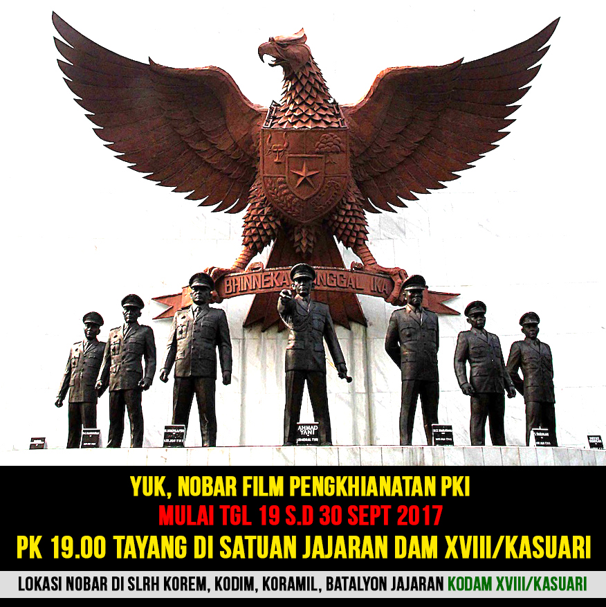 Untuk itu Kodam XVIII/Kasuari mengundan serta mengajak seluruh masyarakat terutama para generasi muda agar dapat hadir dan mengikuti kegiatan Nonton Bareng (Nobar), Film G30 S PKI yang akan ditayangkan di Aula Makodam XVIII/Kasuari.