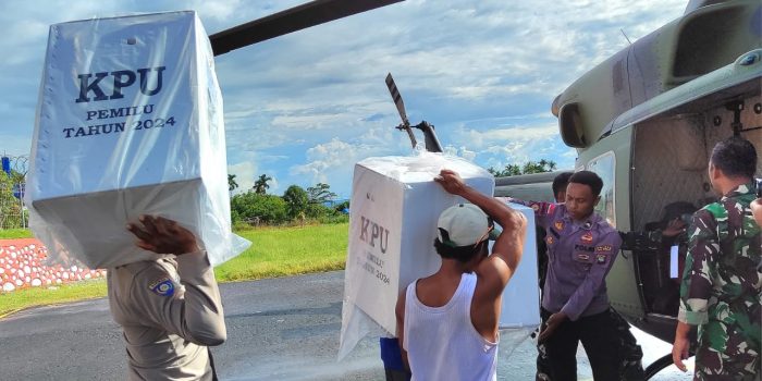 TNI mengerahkan Helikopter Bell 412 EP untuk membantu distribusi logistik Pemilu 2024 ke pedalaman Teluk Wondama, yaitu Kampung Oyaa, Distrik Naikere pada hari Selasa, 13 Februari 2024.