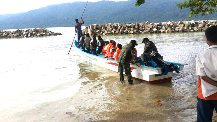 Sorong – Kegiatan Koramil 1704-10/Makbon di wilayah binaan Kabupaten Sorong kini semakin tajam. Sebab, jajarannya Para Babinsa membantu warga dan anak sekolah menyeberang menggunakan perahu, dikarenakan SD Negeri Makbon ke Kampung Kwadas, Kampung Baengkete, Kampung Mibi dan Kampung Malamkarta ditempuh dengan transportasi laut, Kamis (08/06/2017).