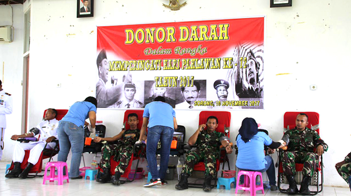 Sorong – Kegiatan Donor Darah dalam rangka memperingati Hari Pahlawan Tahun 2017, Denkesyah 17.04.01/Sorong yang bekerja sama dengan Dinas Kesehatan dan PMI Cab. Sorong dihadiri oleh para Komandan Satuan dan Kabalak Aju jajaran Korem 171/PVT, Prajurit Marhanlan XIV/Sorong serta yang bertempat di Aula Kantor Bupati Kabupaten Sorong, Jl. Klamono, Km 24, Sorong – Papua Barat, Sabtu (11/11/17).