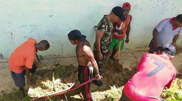 Sorong – Membantu kesulitan masyarakat sudah menjadi tanggung jawab seorang aparat teritorial, apalagi menjadi seorang Babinsa yang selalu berada diwilayah binaannya, sudah barang tentu jika diwilayahnya ada kegiatan sekecil apapun babinsa harus terjun secara langsung untuk membantu. Seperti halnya yang dilakukan Babinsa Koramil 1704-07/Seget Serda Sugiyanto melaksanakan gotong royong di daerah binaannya dengan membantu warga binaan dalam rangka menimbun tanah pembuatan rumah Bapak Benyamin Katunlas (Tokoh Adat) di Kampung Saigun Distrik Saigun Kabupaten Sorong, Rabu (10/01/18).
