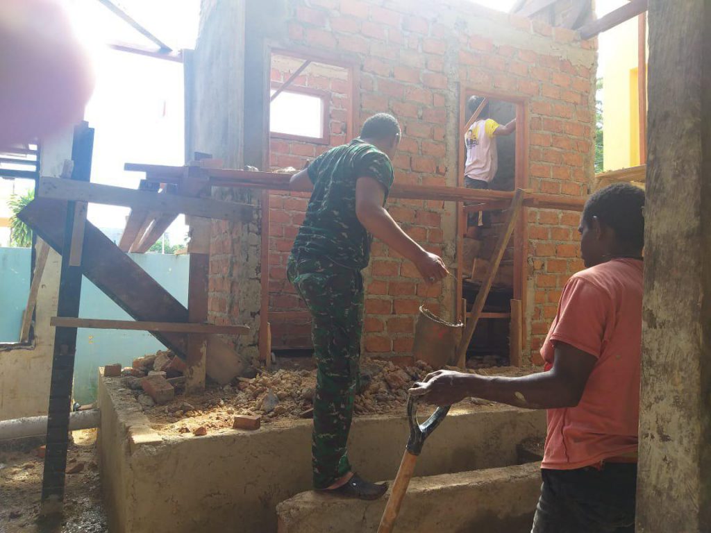 Mayor Inf Sumardi yang menjabat sebagai Danramil 1802-02/Sorong Barat mengatakan pada kesempatan ini Babinsa Sorong Barat membantu proses pemplesteran dinding rumah.