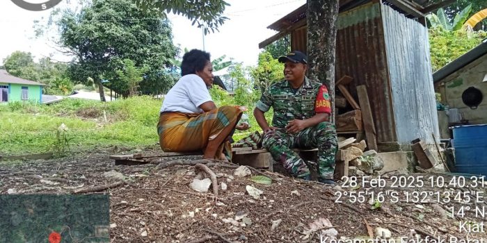 Babinsa Koramil 1803-01/Ffk. Dalam rangka mendukung tugas pokok Babinsa serta terwujudnya kemanunggalan TNI dengan rakyat Babinsa Koramil 1803-01/Ffk Serda Syarifudin Wantogar melaksanakan KOMSOS bersama warga Kampung Kiat Ibu Aisa Tuturop Di Kp. Kiat, Dist. Fakfak Jum’at, (28/02/2025)
