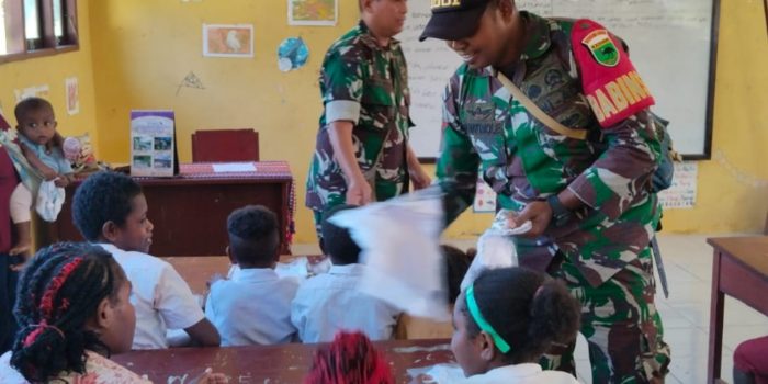 Dalam rangka menyambut perayaan Natal, Danramil 1801-02/Warmare Kapten Inf Prapto Widodo bersama Babinsa melaksanakan kegiatan pembagian bingkisan berupa kaos Natal dari Kasad kepada para siswa SD Negeri 84 Kampung Duwin, Distrik Warmare, Kabupaten Manokwari, Provinsi Papua Barat, Kamis (12/12/2024)