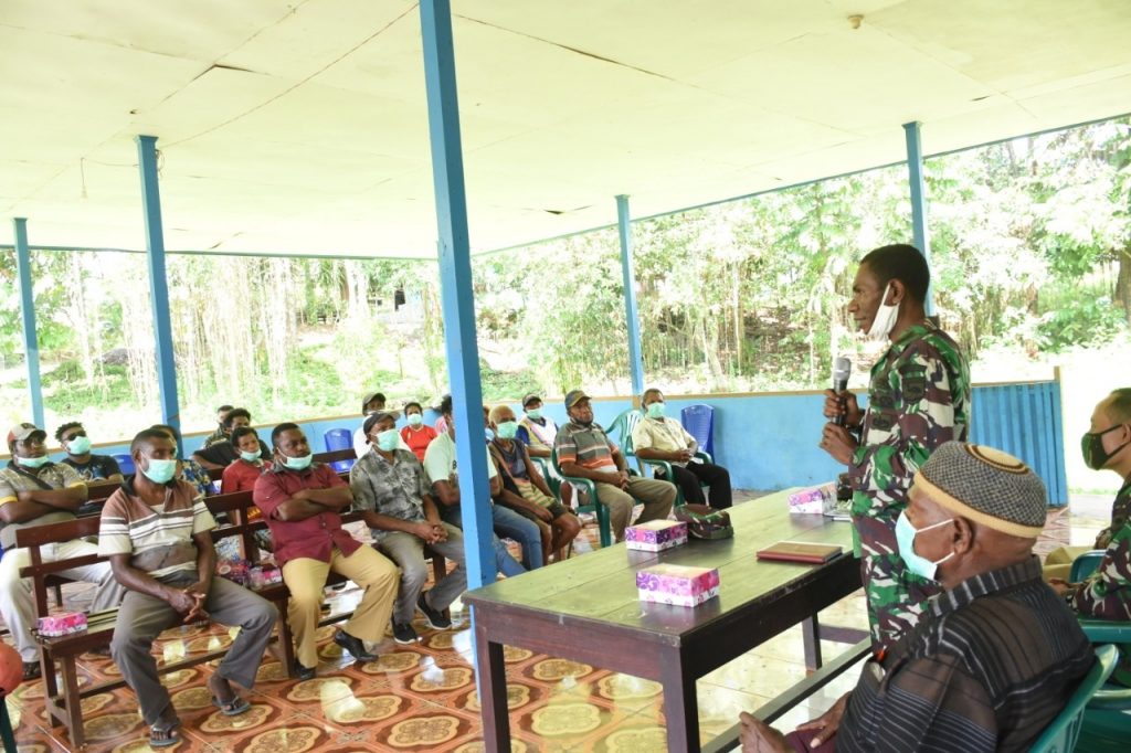 Manokwari. kodam18kasuari.tni-ad.mil.id – Penerangan Kodam (Pendam) XVIII/Kasuari menyelenggakan Karya Bakti (Karbak) TNI Satuan Komando Non Kewilayahan (Satnonkowil), dengan melaksanakan Sosialisasi Pencegahan Covid-19 dan wawasan kebangsaan (Wasbang), Rabu (12/8/2020) di Kampung Katebu, Manokwari, Papua Barat.