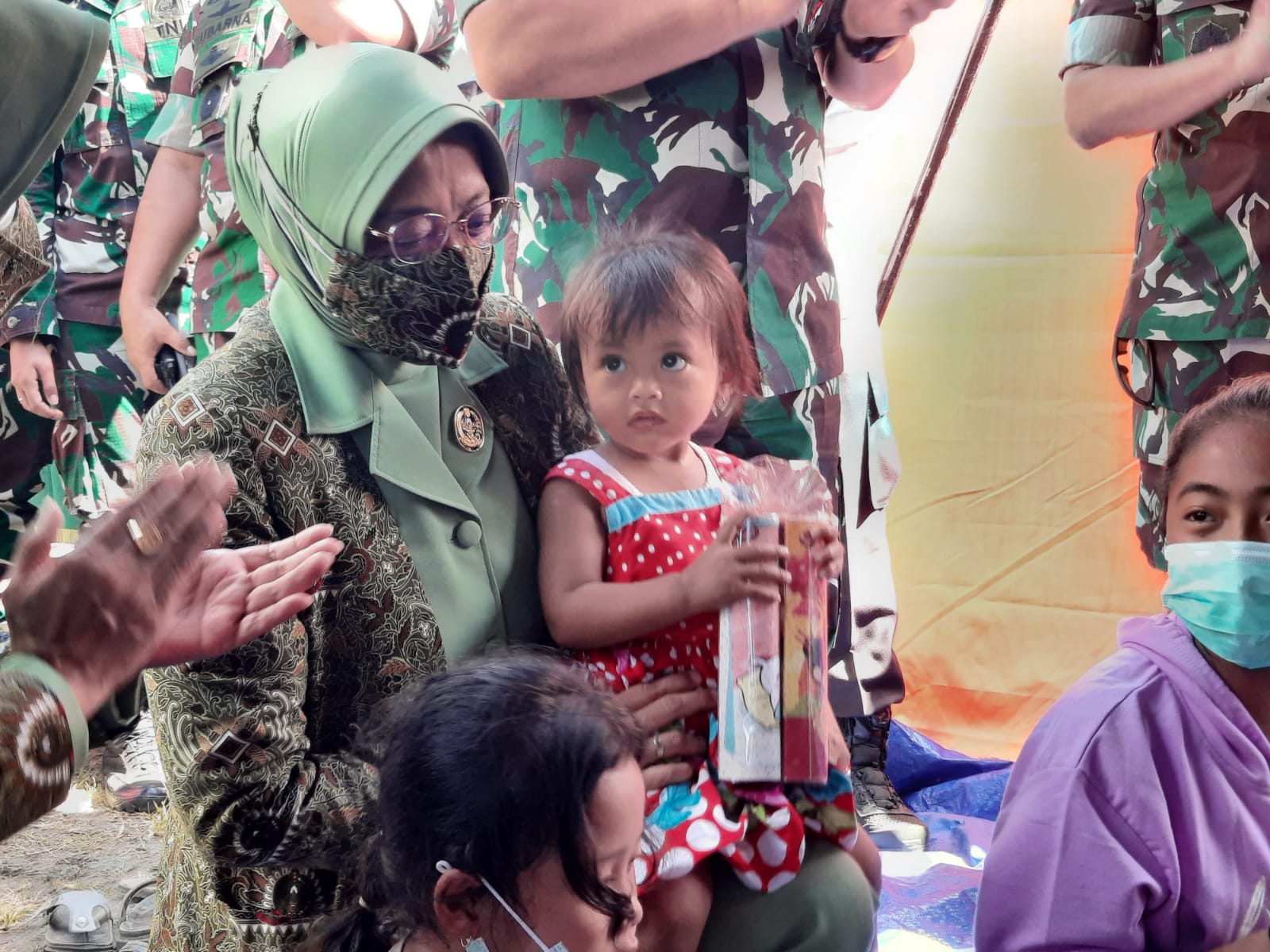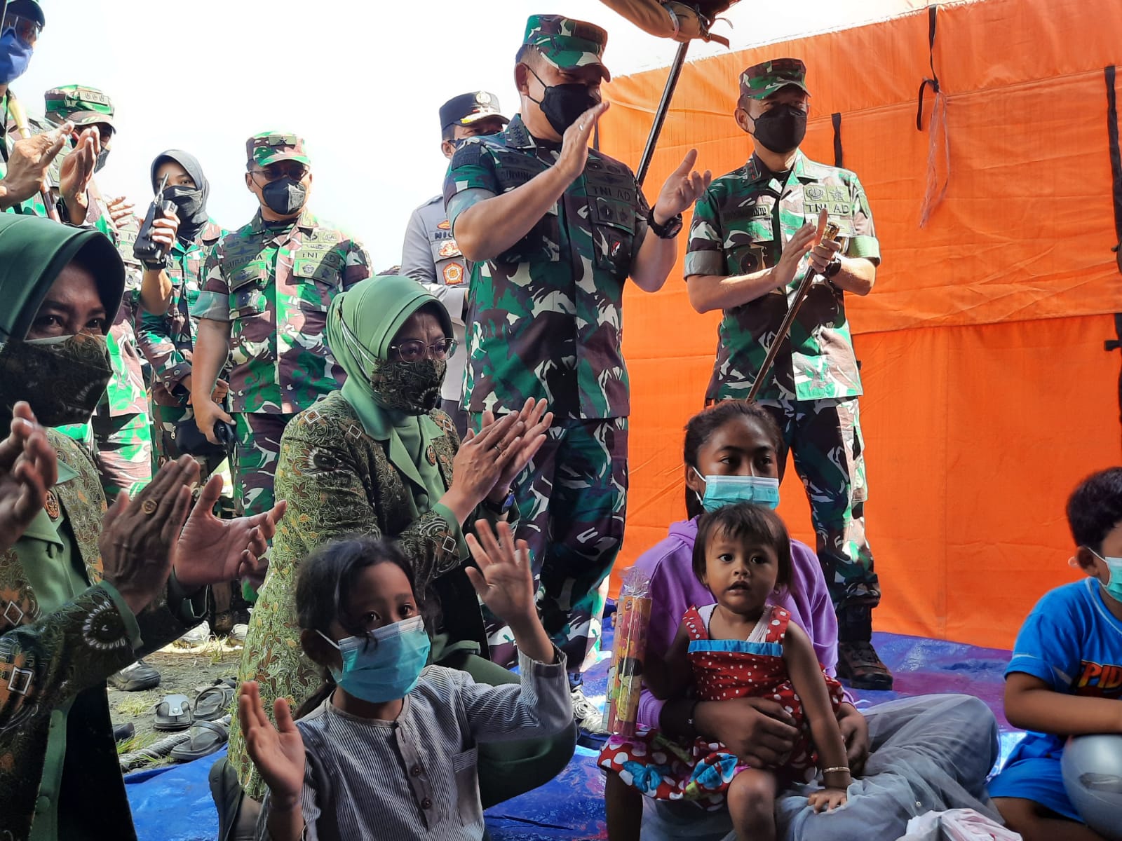 Usai melaksanakan peninjauan ke lokasi pengungsian di sekitar Posko Lapangan di Candipuro, Kasad dan rombongan mengunjungi Pos Kesehatan melihat kegiatan trauma healing bagi anak- anak yang diselenggarakan oleh personel Kesdam V/Brawijaya.