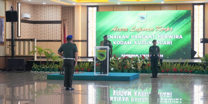 Manokwari. kasuari18-tniad.mil.id – Kodam XVIII/Kasuari menggelar acara laporan korps kenaikan pangkat untuk para perwira di lingkungan Kodam XVIII/Kasuari. Acara tersebut dipimpin langsung oleh Kasdam XVIII/Kasuari, Brigjen TNI Yusuf Ragainaga, di Aula Makodam XVIII/Kasuari, Manokwari, Papua Barat, pada Selasa (1/10/2024).