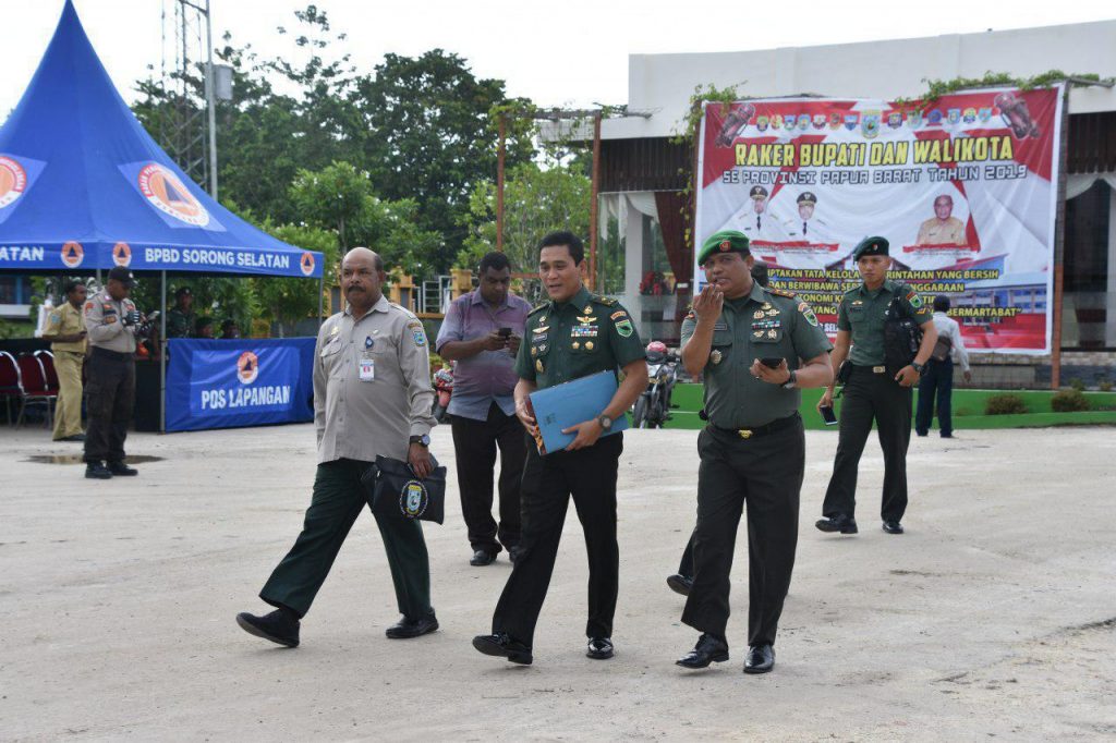 Pada hari Selasa tanggal, 30 April 2019 pukul 08.30 Wit, Kasdam XVIII/Kasuari Brigjen TNI Dedi Sambowo menghadiri Raker Bupati dan Walikota se-Provinsi Papua Barat dihadiri oleh Gubernur Papua Barat Drs. Dominggus Mandacan, Wakil Gubernur Papua Barat Mohammad Lakotani, Sekda Papua Barat Drs. Nataniel D. Mandacan, Ketua DPR Papua Barat Pieter Kondjol, Forkopimda Provinsi Papua Barat, Kota dan Kabupaten Sorong, Walikota dan Provinsi Papua Barat, Kasi Teritorial Korem 181/ PVT Kolonel Inf Luhut B. Sidabariba, Kapolres Sorong Selatan Hans Rachmatulloh Irawan S.IK., Korwil Sorong Raya Binda Papua Barat Letkol H.R. Morin, Danramil 1802-02/Teminabuan Mayor Inf. Irwan, Forkopimda. Wakil Kepala Kejaksaan Tinggi Papua Nikolaus B Kondomo,SH., Para Kepala Dinas Prov. Papua Barat, Kota dan Kab. Sorong, yang di hadiri -+ 300 Orang, bertempat di Hotel Mratua Sesna, Jalan Poros Teminabuan – Ayamaru, Distrik Teminabuan, Kabupaten Sorong Selatan-Provinsi Papua Barat.