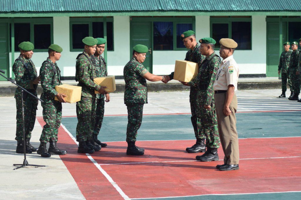 Sorong – Plh Kasdim 1802/Sorong Mayor Inf H. Triyana, S.Pd.I M.Pd.I membagikan bingkisan tunjangan hari raya (THR) kepada anggota baik prajurit maupun PNS jajaran Kodim 1802/Sorong bertempat di lapangan apel Makodim 1802/Sorong, Senin (27/05/2019).