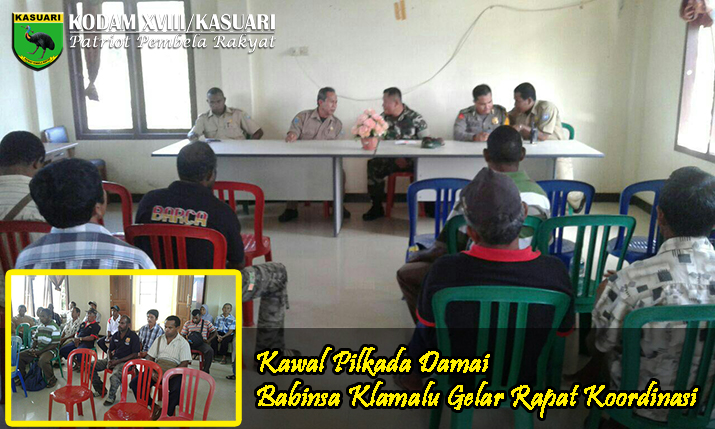 Sorong – Serda Sudarno Babinsa Koramil 1704-01/Sorong Timur melaksanakan rapat koordinasi tentang Keamanan dan Ketertiban Masyarakat (Kamtibmas) menjelang Pilkada 2017 yang akan digelar tanggal 15 februari mendatang, bertempat di Kantor Lurah Klamalu SP 1 jalan Tuturuga Kabupaten Sorong, Sabtu (11/02/17).