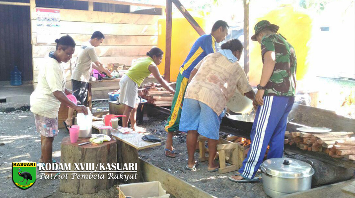 Manokwari – Guna memenuhi logistik sehari-sehari, selama pelaksanaan TMMD Reguler ke-98 Kodim 1703/Manokwari, anggota satgas TMMD bersama masyarakat melaksanakan kegiatan memasak di dapur umum Kampung Muturi Distik Manimeri Kab. Teluk Bintuni Prov. Papua Barat, Minggu, (16/04/17).