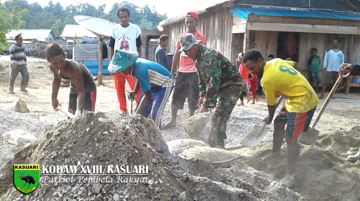 Sorong – Babinsa Koramil 1704-08/Misol Jajaran Kodim 1704/Sorong bersama masyarakat Kampung Kaerepop melaksanakan karya bakti pengecoran jalan Kampung Kaerepop, Distrik Misol Selatan, Kabupaten Raja Ampat, Senin (17/04/17).