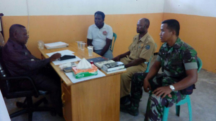 Kabare – Demi menjaga hubungan yang harmonis antara Babinsa dengan masyarakat dan aparat pemerintahan yang berada di wilayah binaannya, Babinsa Kampung Duber Koramil 1704-09/Kabare Serda Iswahyudi melaksanakan Komsos di Kantor Distrik Supnin Bapak Abner Sanoi dan kepala kampung Duber, Distrik Kabare, Kab Raja Ampat, Jumat (20/10/2017).