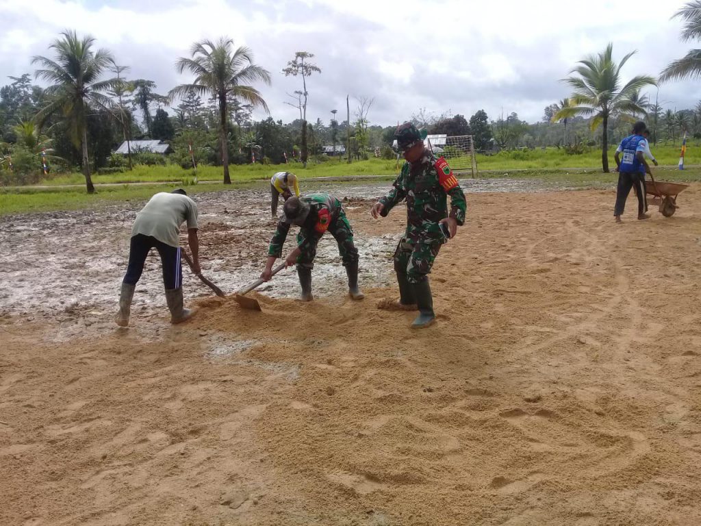 “Hari ini personil Koramil 1802-06/Beraur bersama masyarakat turun ke lapangan bergotong royong menimbun lapangan yang tampak rusak atau berlumpur, yang sebelumnya di gunakan untuk petandingan sepak bola dalam rangka memeriahkan HUT RI ke 74,” kata Serda Dedi Mulyadi.