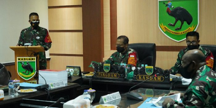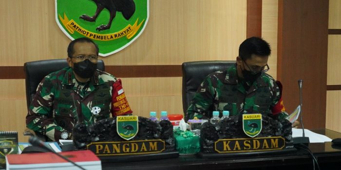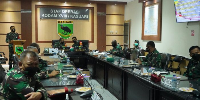 Pangdam XVIII/Kasuari Mayjen TNI I Nyoman Cantiasa, S.E., M.Tr.(Han)., selaku Panglima Kogasgabpad (Pangkogasgabpad) menyampaikan Perintah Operasi (PO) secara virtual terkait Pemberlakuan Pembatasan Kegiatan Masyarakat (PPKM) dan Kogasgabpad XVIII/Kasuari, kepada jajaranya di Ruang Rapat Sopsdam XVIII/Kasuari, Trikora, Arfai 1, Manokwari, Papua Barat, Selasa (13/7/2021).