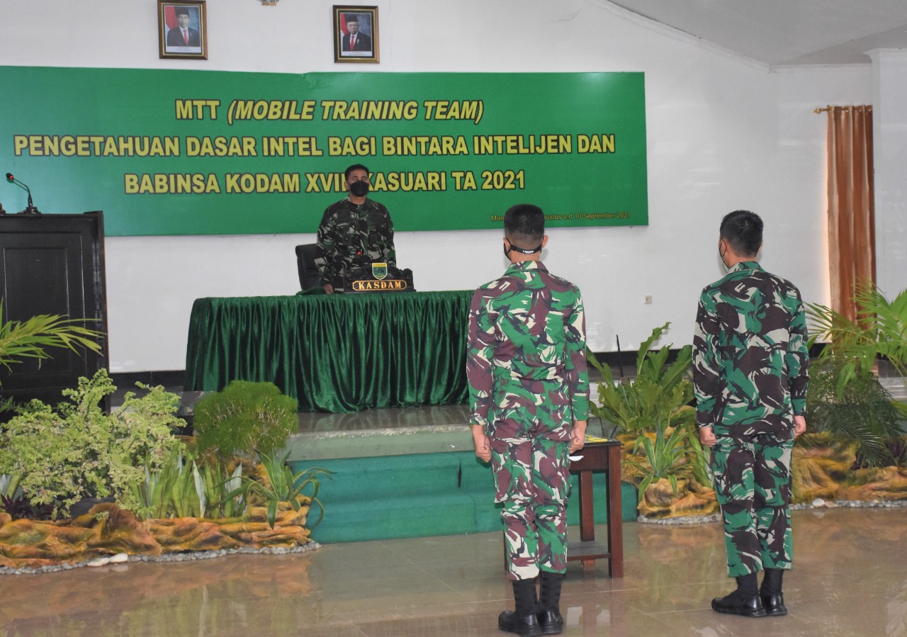 Manokwari. kodam18kasuari.tni-ad.mil.id – Kodam XVIII/Kasuari menggelar penataran Mobile Training Team (MTT) pengetahuan dasar Intel Kodam XVIII/Kasuari TA. 2021 bagi Bintara dan Babinsa di lingkungan Kodam XVIII/Kasuari.