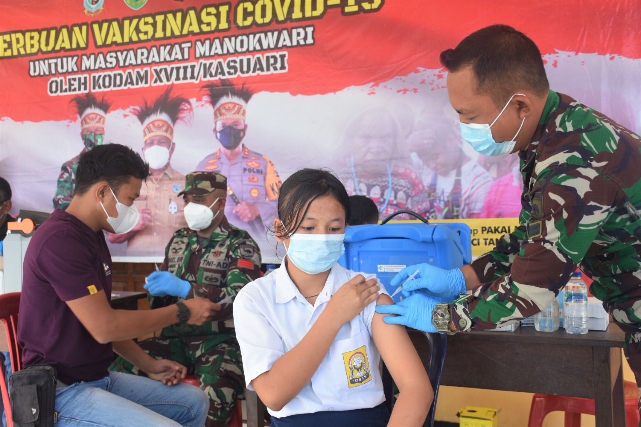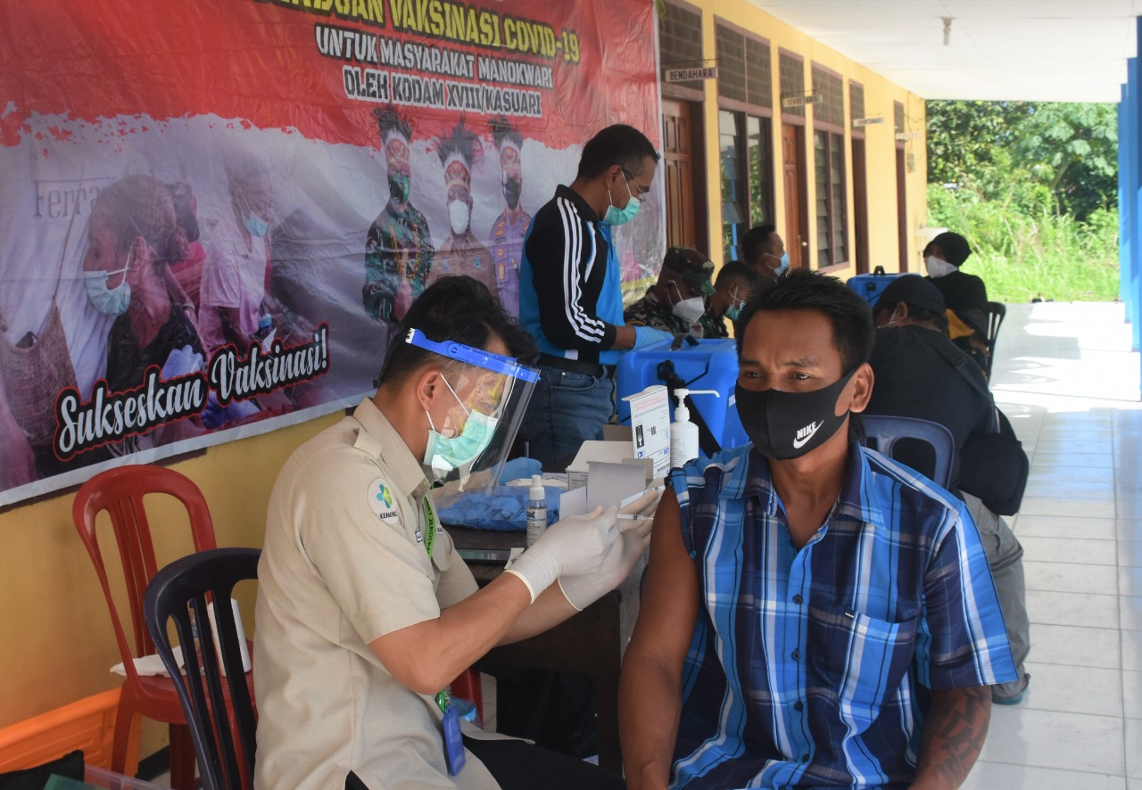 Melalui Kesehatan Kodam (Kesdam) vaksinasi dilakukan di Balai Kampung Aimasi, SP3, Distrik Prafi, Kabupaten Manokwari, Papua Barat yang mendapatkan cukup banyak antusias dari masyarakat setempat.
