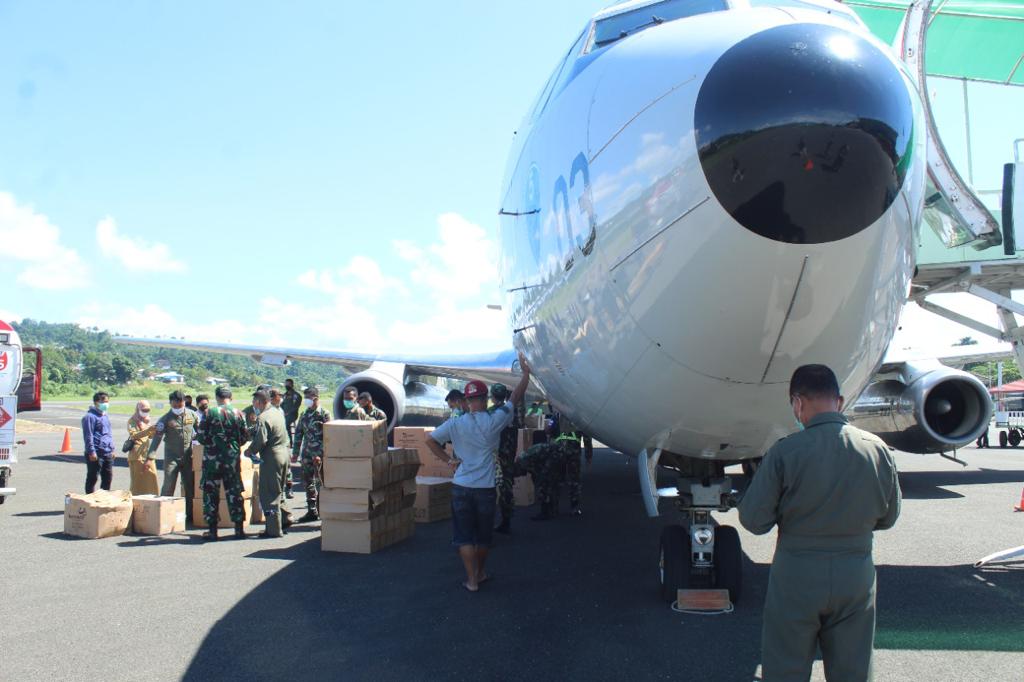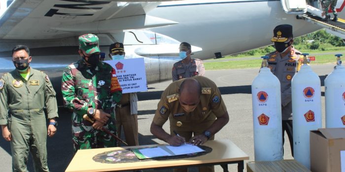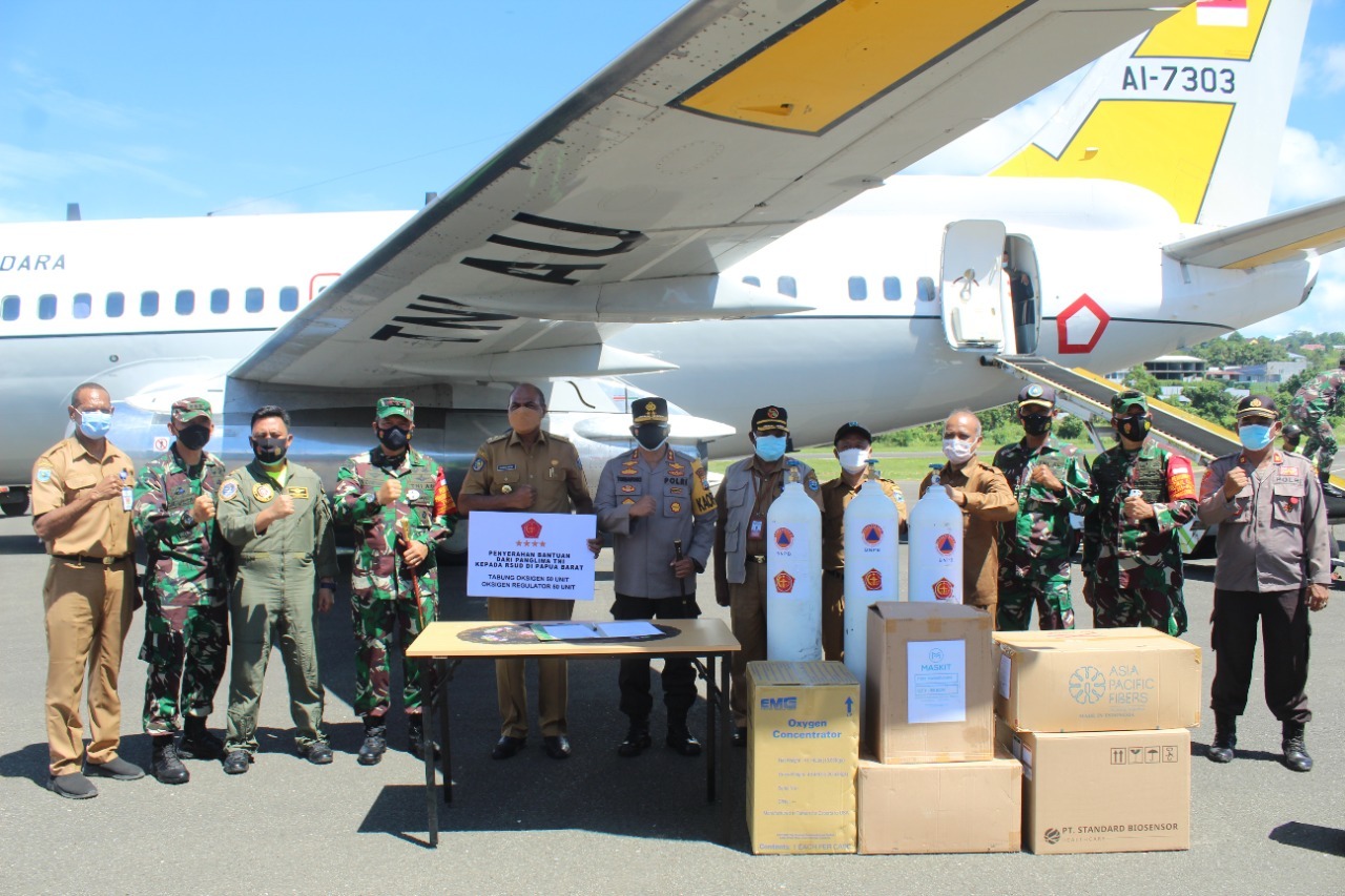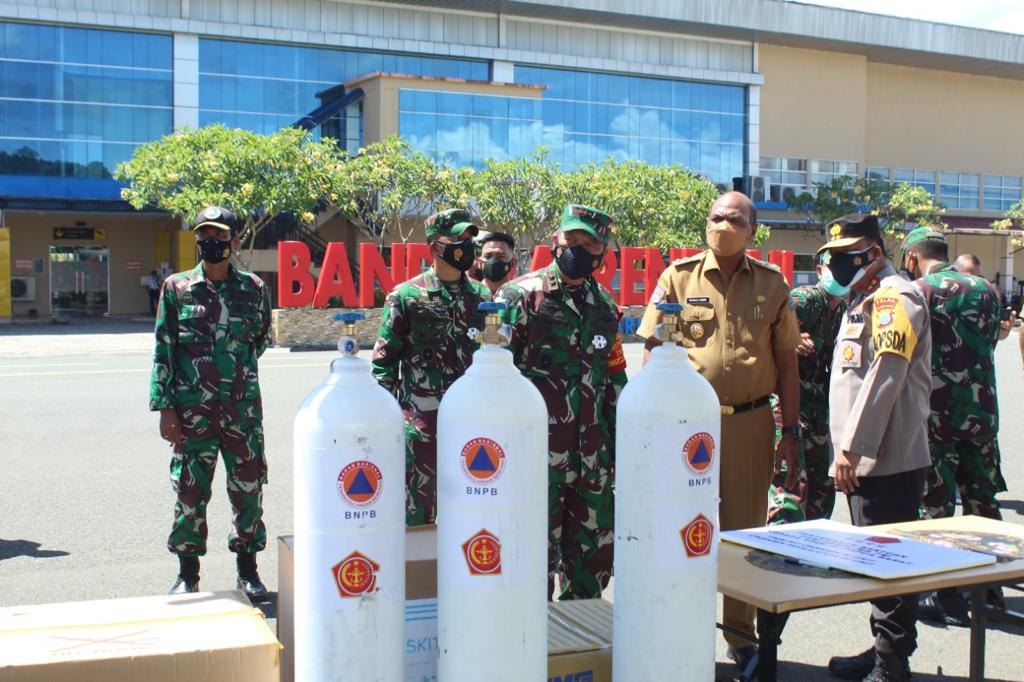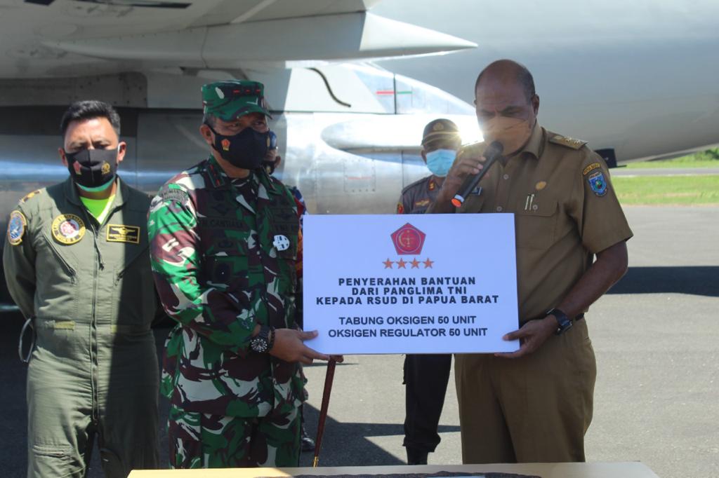 Bantuan diterima langsung Pangdam XVIII/Kasuari, Mayjen TNI I Nyoman Cantiasa, S.E., M.Tr.(Han)., bersama Wakil Gubernur (Wagub) Provinsi Papua Barat, Mohamad Lakotani, S.H., M.Si., Kapolda Papua Barat, Irjen Pol. Dr. Tornagogo Sihombing, S.I.K.,M.Si., di Bandara Rendani, Manokwari, Papua Barat, Selasa (03/08/2021).