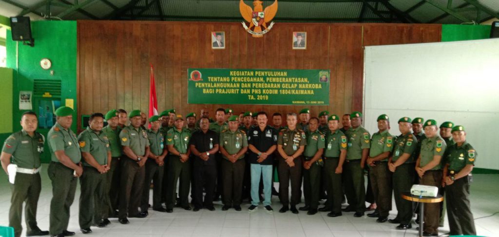 Kaimana – Kodim 1804/Kaimana melaksanakan kegiatan Penyuluhan Pencegahan Pemberantasan Penyalahgunaan dan Peredaran Gelap Narkoba atau yang lebih dikenal dengan P4GN bertempat di Aula Makodim, Rabu (12/06/2019).