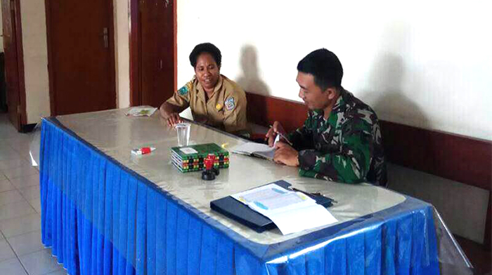 Sorong – Bintara Pembina Desa (Babinsa) Kel Klasaman Distrik Klaurung Serda Sudirman Koramil 1704-01/Sorong Timur melaksanakan Komsos dengan Ibu Meri Staf kelurahan di kantor kel. Klamalu Distrik Mariat Kab Sorong Rabu (14/03/2018).