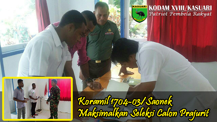 Sorong – Jajaran Kodim 1704/Sorong secara serentak melaksanakan seleksi terhadap Putra dan Putri Bangsa yang telah mendaftar dan ingin mengabdi sebagai Prajurit TNI AD, khususnya untuk Koramil 1704-03/Saonek kini telah menyeleksi sebanyak 49 orang calon Prajurit TNI – AD dan saat ini telah masuk dalam tahap tes Kesehatan, Jumat (10/02/17)