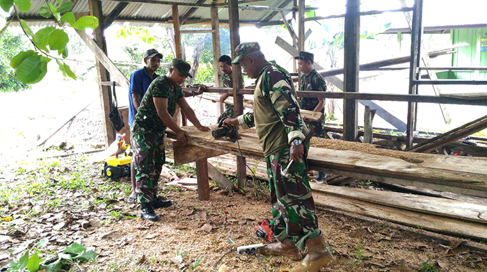 Manowari – Dalam rangka mengatasi kesulitan masyarakat dan meningkatkan kebersamaan antara TNI dan Rakyat, Anggota Koramil 1703-08/Babo sebanyak 5 orang yang dipimpin Serma La Ode melaksanakan karya bakti pembangunan rumah tokoh masyarakat Bapak Edoardo Wamrafar di Kampung Irarutu III, Distrik Babo, Kab. Teluk Bintuni, (Sabtu 03/06/2017)