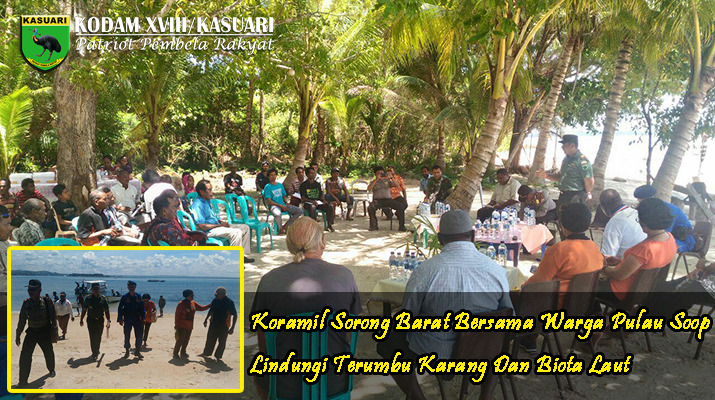 Sorong – Dalam menjaga dan melestarikan lingkungan alam khususnya kawasan laut yang terletak di Pulau Soop Distrik Sorong Kepulauan di Wilayah teritorial Koramil 1704-13/Sorong Barat, Danramil Sorong Barat mengajak masyarakat Kelurahan Soop untuk bersama-sama mengelola pantai dan menjaga kearifan lokal di daerahnya, Senin (13/02/17).