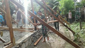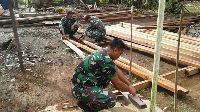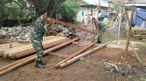 Manokwari – Dalam rangka mengatasi kesulitan masyarakat di wilayah binaan, Koramil 1703-04/Warmare sebanyak 4 orang melaksankan kegiatan karya bakti membangun rumah masyarkat di Kampung Dindey Distrik Warmare Kab. Manokwari Prov. Papua Barat, Senin (16/07/2018).