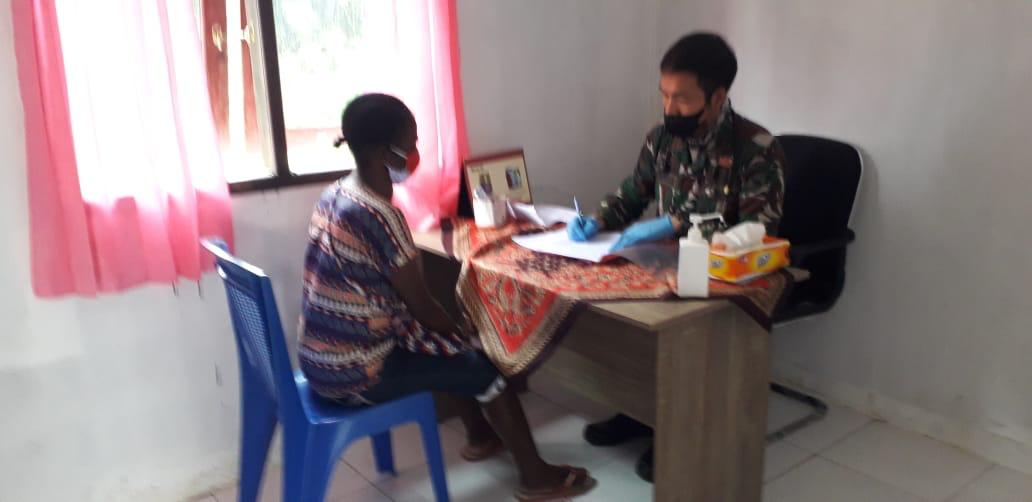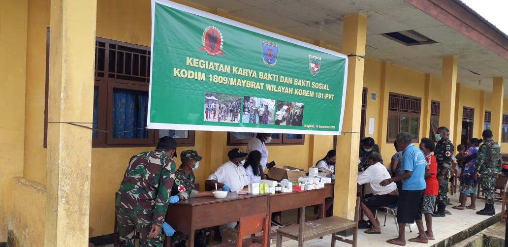 Maybrat. kodam18kasuari.tni-ad.mil.id – Jajaran Korem 181/PVT, Kodam XVIII/Kasuari bekerjasama dengan Dinas Kesehatan (Dinkes) Kabupaten Maybrat menggelar kegiatan bakti sosial (Baksos) berupa pelayanan kesehatan kepada warga di Distrik Aifat, Kabupaten Maybrat, Selasa (14/9/2021).