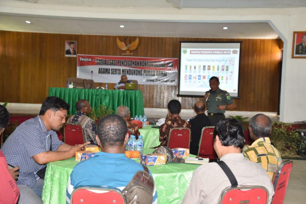 Sorong – Korem 181/PVT melaksanakan Sosialisasi Pencegahan Konflik Sosial dan Agama serta mendukung Pemilu Damai dengan nara sumber Kasi Intel Korem 181/PVT Kolonel Inf. Albert Panjaitan dan Ketua Lintas Suku Sorong Raya, Jeremias Gembenop, S.Sos, M.H, dengan peserta sosialisasi para Tokoh Agama, Tokoh Adat, Tokoh masyarakat dan Tokoh Pemuda Kota Sorong serta para mahasiswa, bertempat di Aula Praja Vira Tama Jln. Pramuka No. 1 Kota Sorong-Papua Barat, Kamis (28/02/2019).