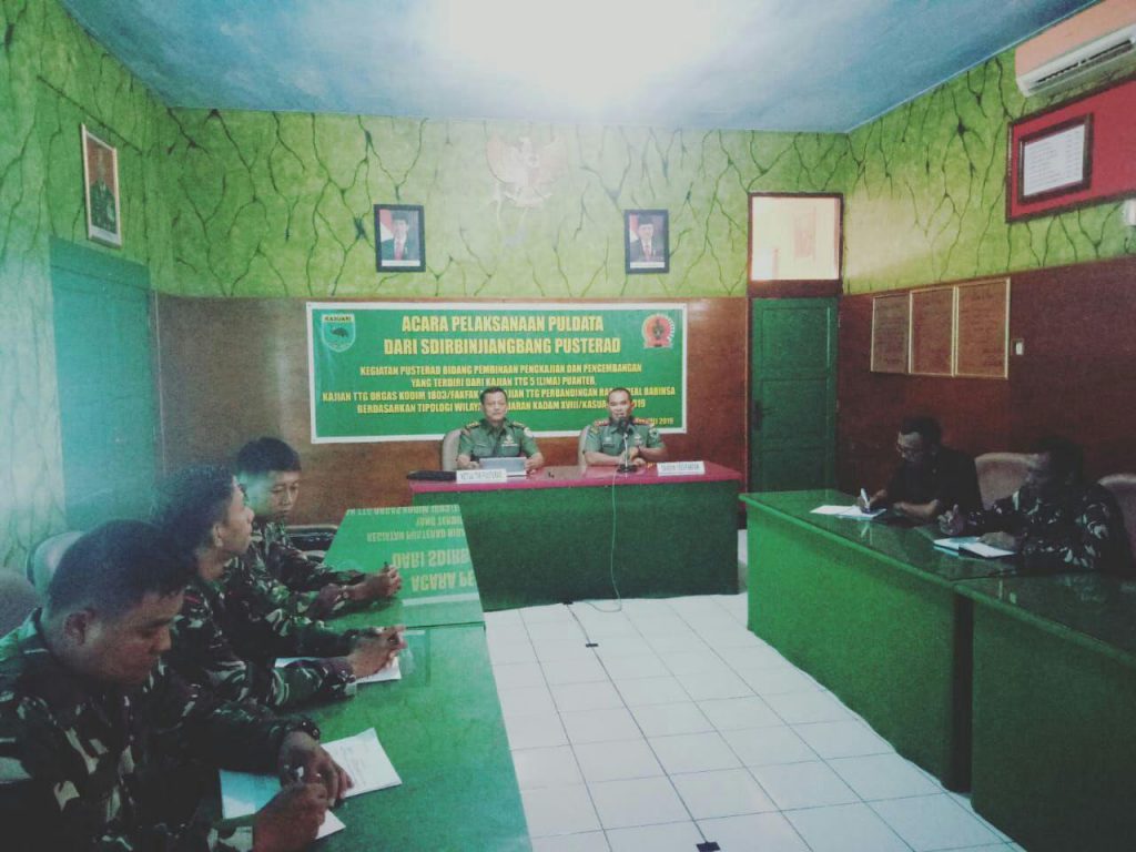 Fakfak – Kodim 1803/Fakfak telah melaksanakan Kegiatan pelaksanaan Pengumpulan data dari sdirbinjianbang Pusterad Bidang pembinaan pengkajian dan pengembangan yang terdiri dari kajian tentang 5 Kemampuan Teritorial, kajian tentang orgas Kodim 1803/Fakfak dan kajian tentang perbandingan Rasio Ideal Babinsa berdasarkan Tipologi wilayah di jajaran Kodam XVIII/Kasuari TA.2019 yg diikuti oleh 13 orang, Bertempat di Ruang Data Makodim 1803/Fakfak, Rabu (08/05/2019).