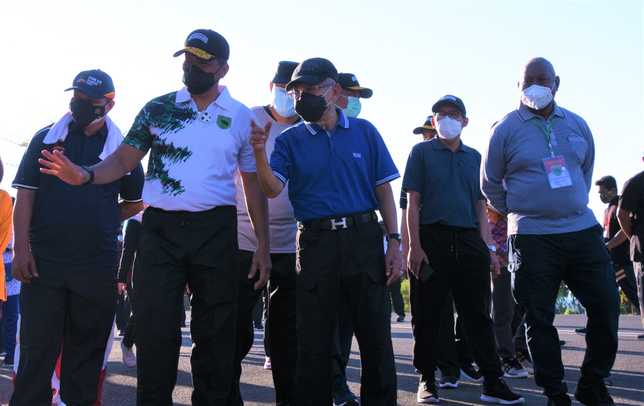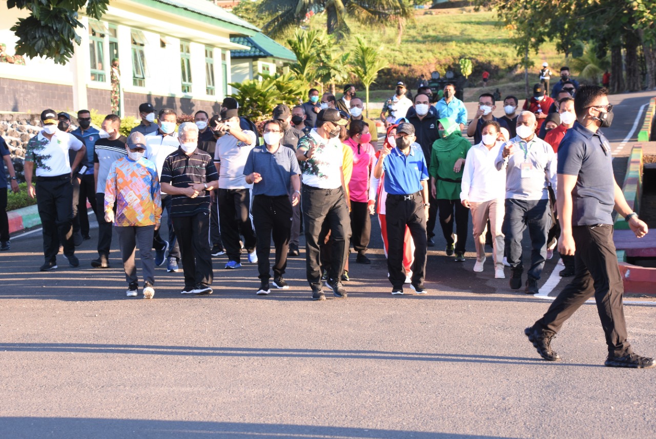 Wapres didampingi Pangdam XVIII/Kasuari, Mayjen TNI I Nyoman Cantiasa, S.E., M.Tr.(Han)., Gubernur Provinsi Papua Barat, Drs. Dominggus Mandacan beserta unsur Forkopimda Papua Barat lainnya melaksanakan olahraga bersama di Makodam XVIII/Kasuari.