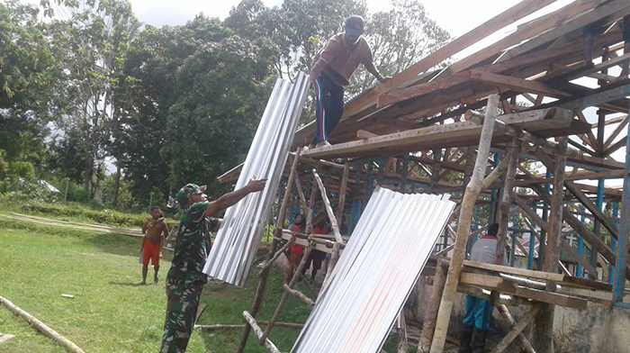 Sorong – Babinsa Koramil 1704-03/Salawati Sertu Yan Deda melaksanakan Pembinaan teritorial (Binter) dengan merenovasi Rumah Ibadah Sekolah Minggu bersama masyarakat Kampung Jeplio Distrik Mayamuk Kabupaten Sorong, Jumat (30/11/2018).