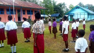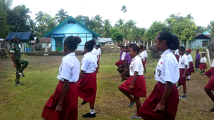 Sorong – Dalam rangka melatih kedisiplinan dan menumbuhkan rasa cinta tanah air terhadap bangsa dan negara, Babinsa Koramil 1704-03/Saonek Sersan Dua Konjol memberikan pelatihan Peraturan Baris Berbaris (PBB) kepada Siswa-siswi SD Inpres 6 Kampung Waifoi, Distrik Tipilol Mayalibit, Kabupaten Raja Ampat, Kamis (08/02/18).