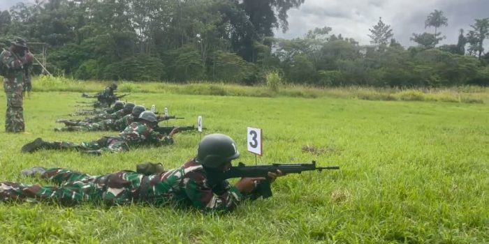 Momi Waren – Sejumlah siswa bintara Infanteri Dodiklatpur Rindam XVIII/Kasuari mengikuti latihan menembak jenis senapan di lapangan tembak Rindam XVIII/Kasuari, Jl.Trans Manokwari – Bintuni, Kamp Dembek, Dist. Momi Waren, Kab. Manokwari Selatan, Prov. Papua Barat Selasa (04/02/2025).