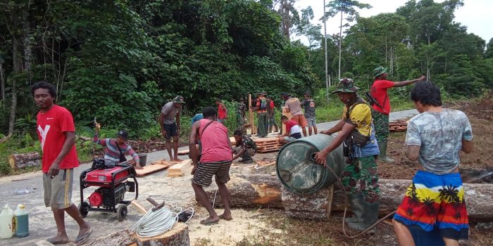 Memasuki hari ketiga program TNI Manunggal Membangun Desa (TMMD) ke-120 TA 2024, Komando Distrik Militer (Kodim) 1811/Teluk Wondama terus kebut pembersihan lahan untuk pembangunan 3 unit rumah untuk masyarakat di Kampung Yabore, Distrik Naikere, Kabupaten Teluk Wondama, Provinsi Papua Barat.