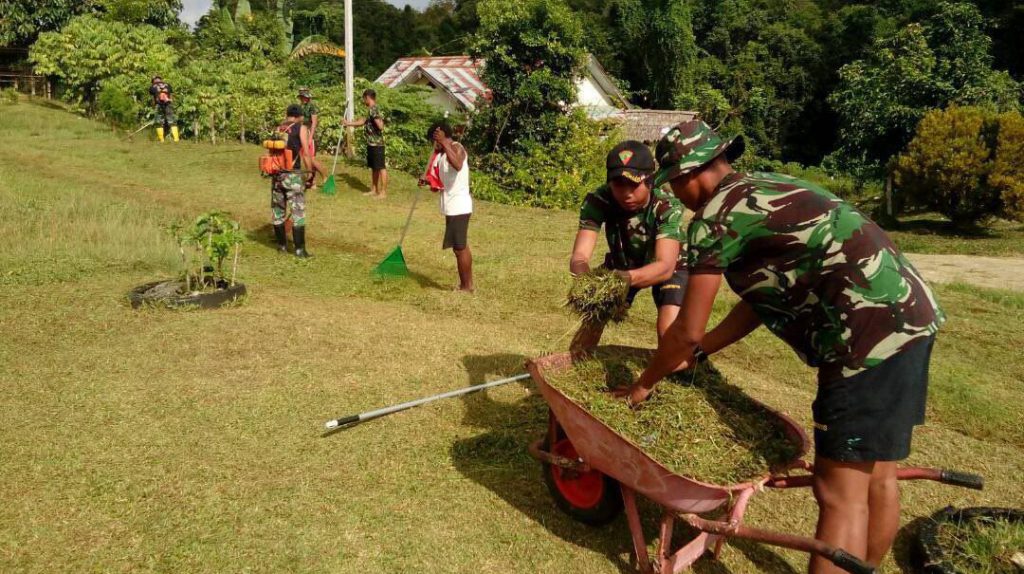 Aifat – Anggota Koramil 1704-12/Aifat dalam serbuan teritorial melaksanakan kegiatan karya bakti pembersihan lingkungan yang bertempat di SD YPK Emaus Susumuk, Distrik Aifat Jaya, Kab Maybrat, Rabu (17/05/17).