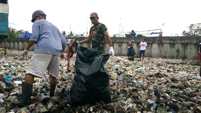 Sorong – Bintara Pembina Desa (Babinsa) 1704-01/Sorong Timur Serda Rudi Labobar dan 6 (enam) Orang Babinsa lainnya bersama masyarakat Kelurahan Malawei membersihkan tumpukan sampah di RT 003 RW 004  Kelurahan Malawei  Distrik Sorong Manoi Kota Sorong, Rabu (25/04/18).
