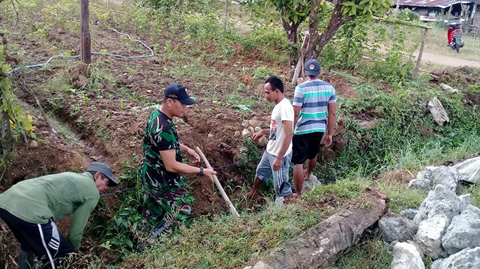 Babinsa Serda Sudarno dengan aparat pemerintah Kampung melaksanakan kerja bakti dengan pembersihan saluran Parit guna memperlancar arus air, untuk menjaga lingkungan tetap bersih dan sehat.