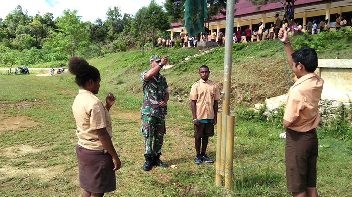 Aifat – Koramil 1704-12/Aifat Kodim 1704/Sorong Serda M. Dato Banbinsa Kampung Susumuk Distrik Aifat Jaya Kab. Maybrat melaksanakan kegiatan pelatihan tata cara pelaksanaan upacara bendera kepada Siswa/i SMPN 2 Susumuk, Kab. Maybrat, Rabu (11/10/2017).