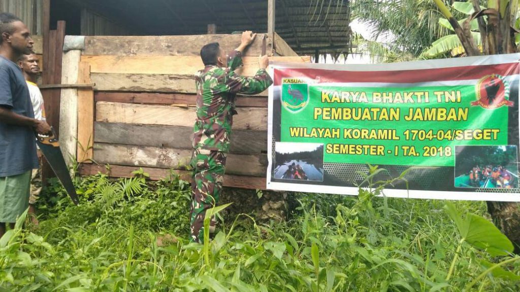 Sorong – Babinsa Kampung Sailen Distrik Salteng Kabupaten Sorong Koramil 1704-04/Seget Serda Sigit bersama warga binaan melaksanakan karya bhakti pembuatan jamban milik Pak Paulus warga Kampung Sailen, Jumat (29/06/2018)