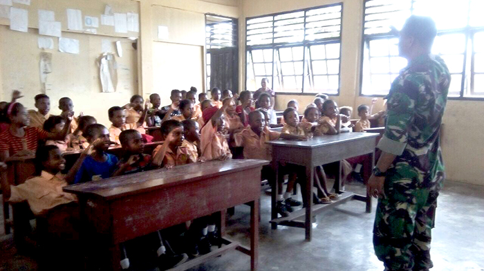 Sorong – Babinsa Kampung Yenbekwan Koramil 1704-03/Saonek Kab Raja Empat Serda La Nuba Melaksanakan Kegiatan Komsos ke Kesekolah SD Inpres 001 Kampung Yenbekwan bertempat di Ruang Kelas 1 SD Inpres 001 Kampung Yenbekwan. Serda La Nuba memberikan arahan tentang wawasan kebangsaan di depan Siswa-Siswi dalam rangka memberikan motifasi belajar dan kekompakan serta jiwa Korsa kepada para siswa-siswi, Selasa (20/02/2018).