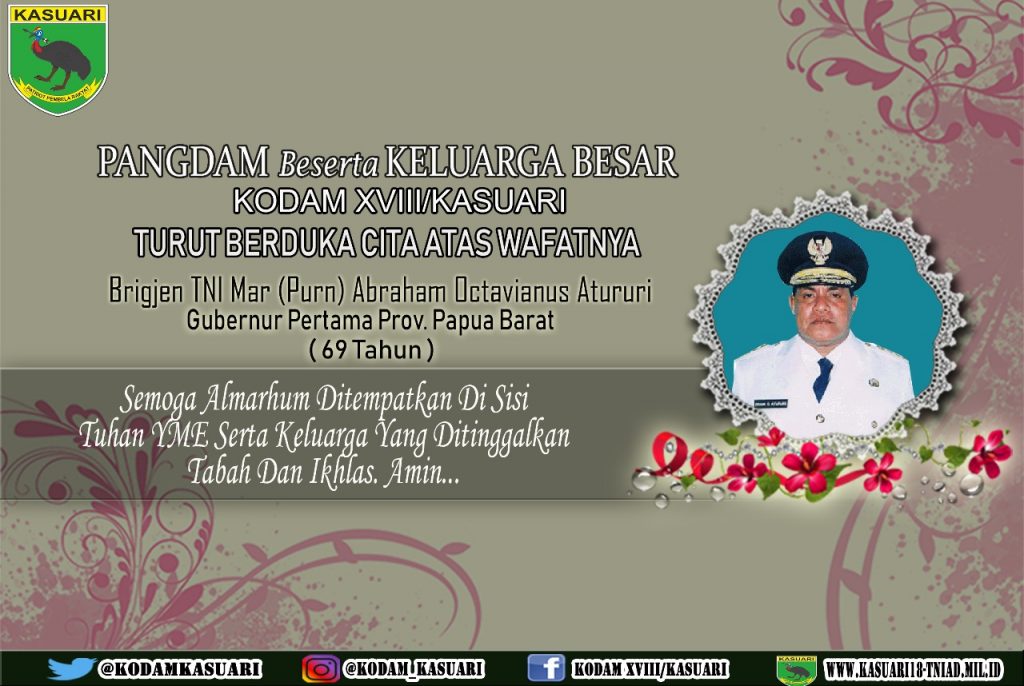 Pangdam Berserta Keluarga Besar Kodam XVIII/Kasuari Turut Berduka Cita Atas Wafatnya Brigjen TNI Mar (Purn) Abraham Octavianus Atururi Gubernur Pertama Prov.Papua Barat (69 Tahun)