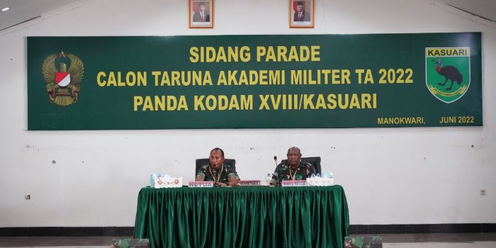 Manokwari. kaauari18-tniad.mil.id – Pangdam XVIII/Kasuari, Mayjen TNI Gabriel Lema, S.Sos., didampingi Kasdam, Brigjen TNI Yusuf Ragainaga memimpin Sidang Penilaian Panitia Penentu Akhir (Pantukhir) Daerah Calon Taruna Akademi Militer (Akmil) TA 2022, di Aula Makodam, Trikora, Arfai 1, Manokwari, Papua Barat, Rabu (29/6/2022).