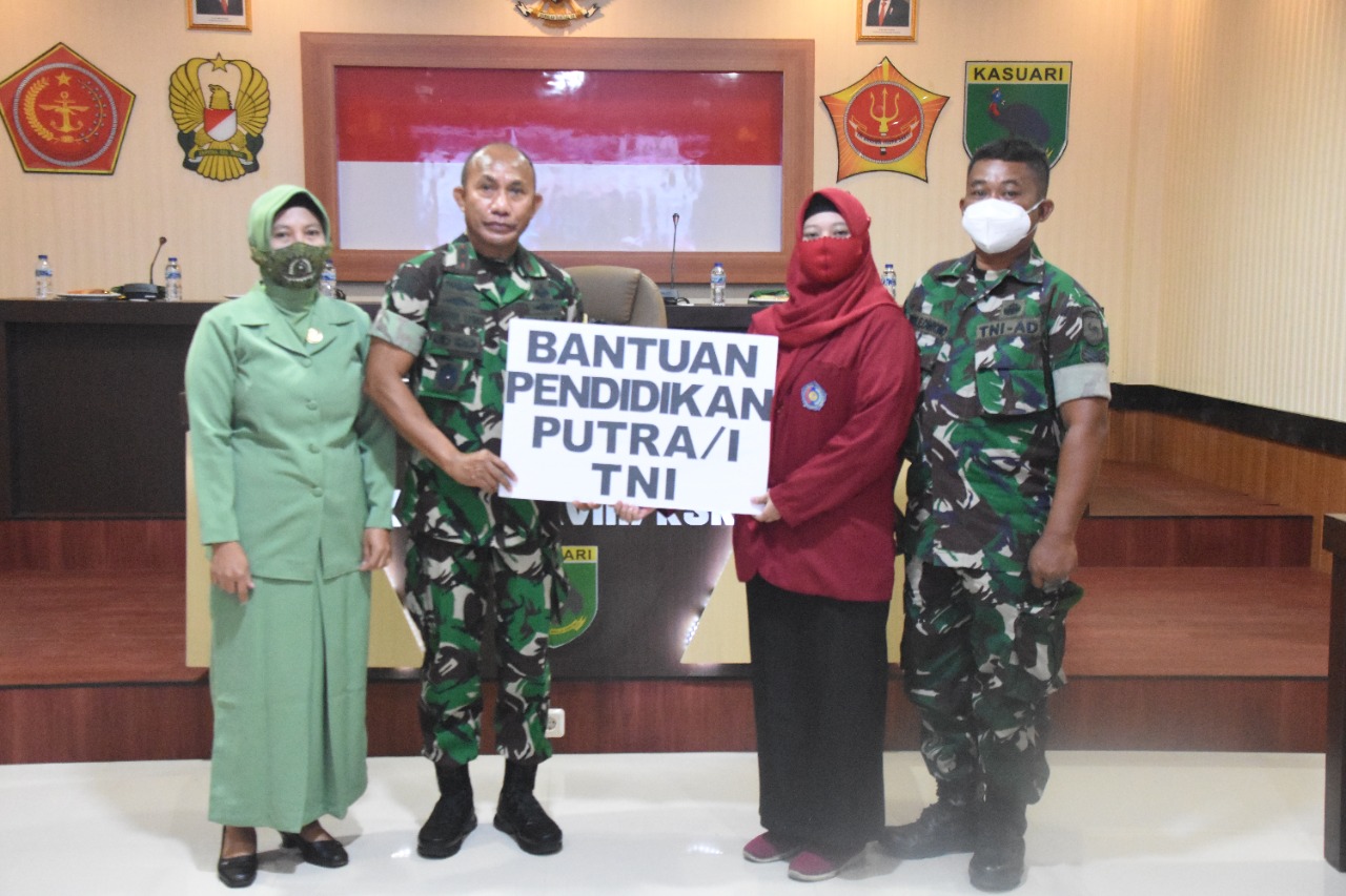 Manokwari. kodam18kasuari.tni-ad.mil.id – Pangdam XVIII/Kasuari, Mayjen TNI Gabriel Lema, S.Sos., didampingi Waaspers Kasdam, Pabandya Watpers dan Karumkit Tingkat IV 18.07.02. JA Dimara Kesdam XVIII/Kasuari, mengikuti vicon yang dipimpin langsung oleh Panglima TNI Jenderal TNI Andika Perkasa bersama Menteri BUMN , Erick Thohir, dari ruang Posko Kodam XVIII/Kasuari, Trikora, Arfai 1, Manokwari, Papua Barat. Kamis, (24/02/2022). Agenda Vicon penyerahan bantuan secara simbolis Program Beasiswa Perguruan Tinggi Bagi Putra dan Putri TNI dan Polri. Beasiswa diserahkan kepada 1.0792 Mahasiswa dan Mahasiswi yang tersebar di seluruh Indonesia. Wilayah Kodam Kasuari diterima oleh Fadhilah Januar Fitria putri dari Serka Budi Endro Cahyono.