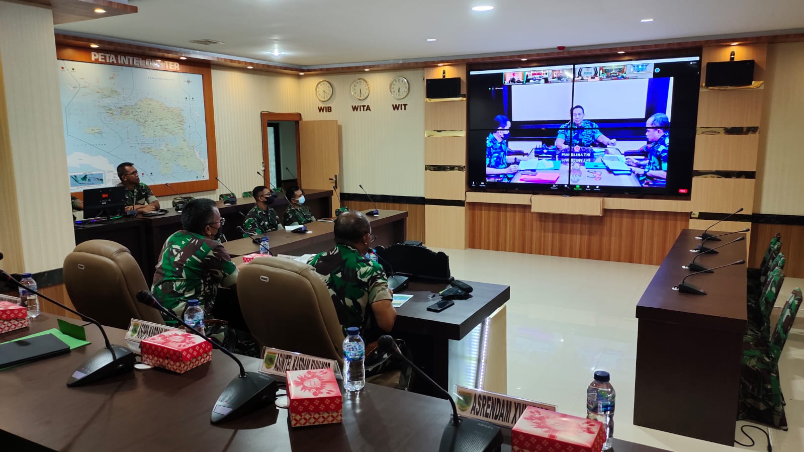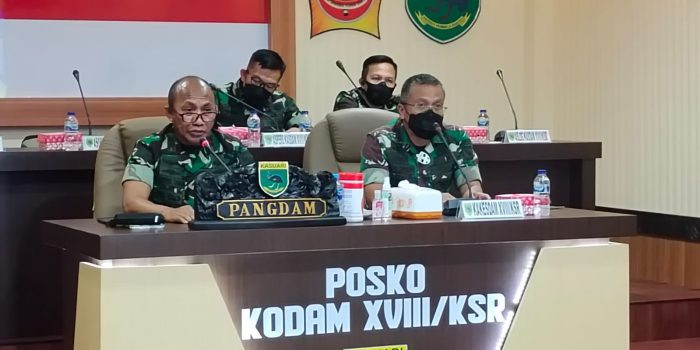 Manokwari. kodam18kasuari.tni-ad.mil.id – Pangdam XVIII/Kasuari, Mayjen TNI Gabriel Lema, S.Sos., didampingi para pejabat Kodam dari ruang Posko Kodam XVIII/Kasuari, Trikora, Arfai 1, Manokwari, Papua Barat, Kamis, (24/02/2022) mengikuti rapat digelar secara virtual yang dipimpin langsung Panglima TNI Jenderal TNI Andika Perkasa. Agenda Vicon ini membahas tentang serbuan vaksinasi yang sudah digelar oleh masing-masing jajaran TNI.