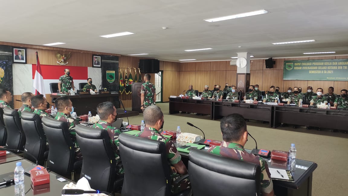 Manokwari. kodam18kasuari.tni-ad.mil.id – Pangdam Kasuari Mayjen TNI Nyoman Cantiasa, S.E., M.Tr.(Han)., didampingi Kasdam XVIII/Kasuari, Brigjen TNI Djoko Andoko memimpin rapat evaluasi pelaksanaan program kerja dan anggaran (Progjagar) Kodam XVIII/Kasuari selaku Kotama Bin TNI AD semester II Tahun Anggaran 2021, bertempat di ruang Yudha Makodam XVIII/Kasuari, Trikora Arfai 1, Manokwari, Papua Barat, Selasa (28/12/2021).