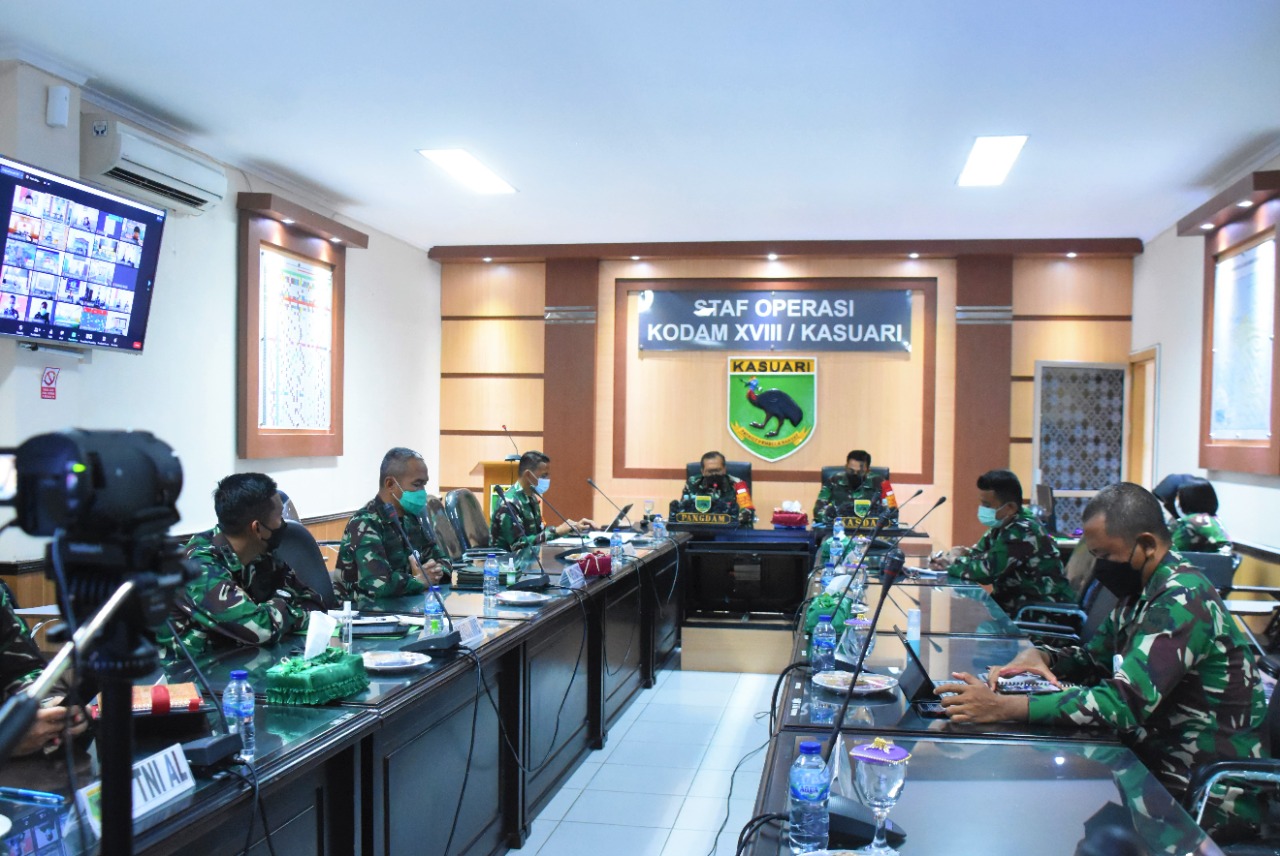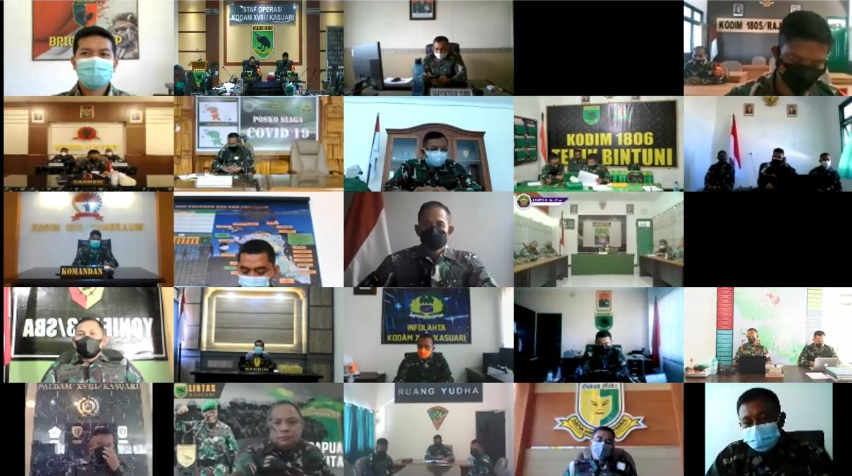 Rapat virtual juga diisi agenda dengan mendengarkan paparan yang disampaikan oleh para Komandan sektor, Danrindam, Danbrigif 26/GP, Danpomdam dan Kakesdam serta para Dandim dan Danyon jajaran Kodam XVIII/Kasuari.
