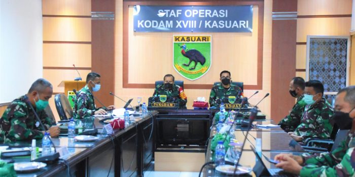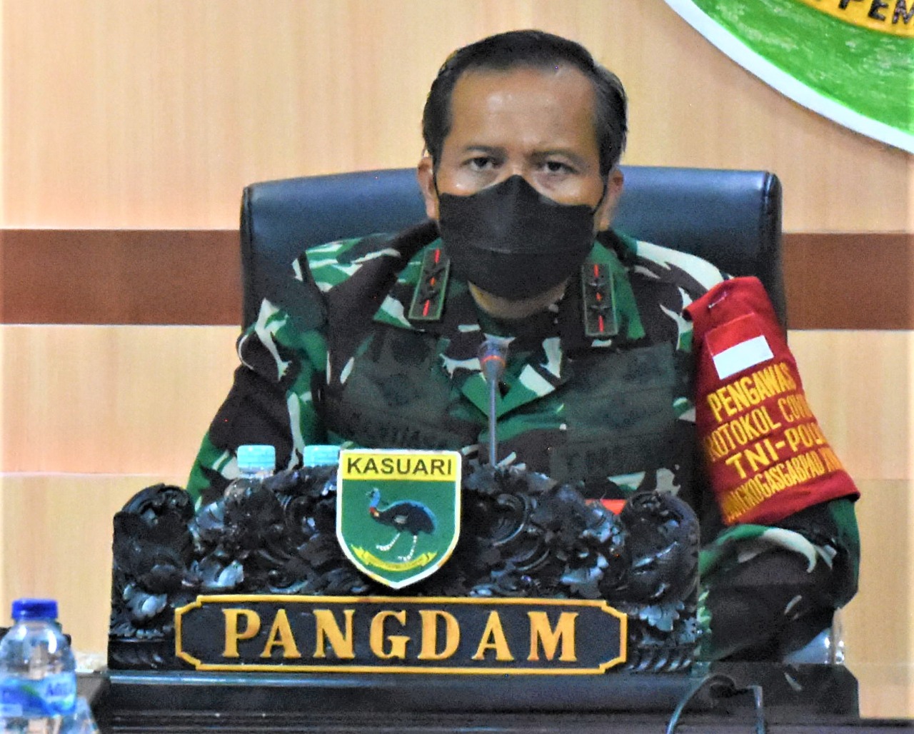 Hal tersebut disampaikan Pangdam XVIII/Kasuari selaku Panglima Komando Tugas gabungan Terpadu (Pangkogasgabpad) saat melakukan evaluasi penanganan Covid-19 di wilayah Papua Barat melalui rapat secara virtual dengan para Komandan Satuan dijajaran Kodam XVIII/Kasuari dari ruang rapat Sopsdam XVIII/Kasuari, Makodam, Trikora, Arfai 1, Manokwari, Papua Barat, Senin (26/7/2021).